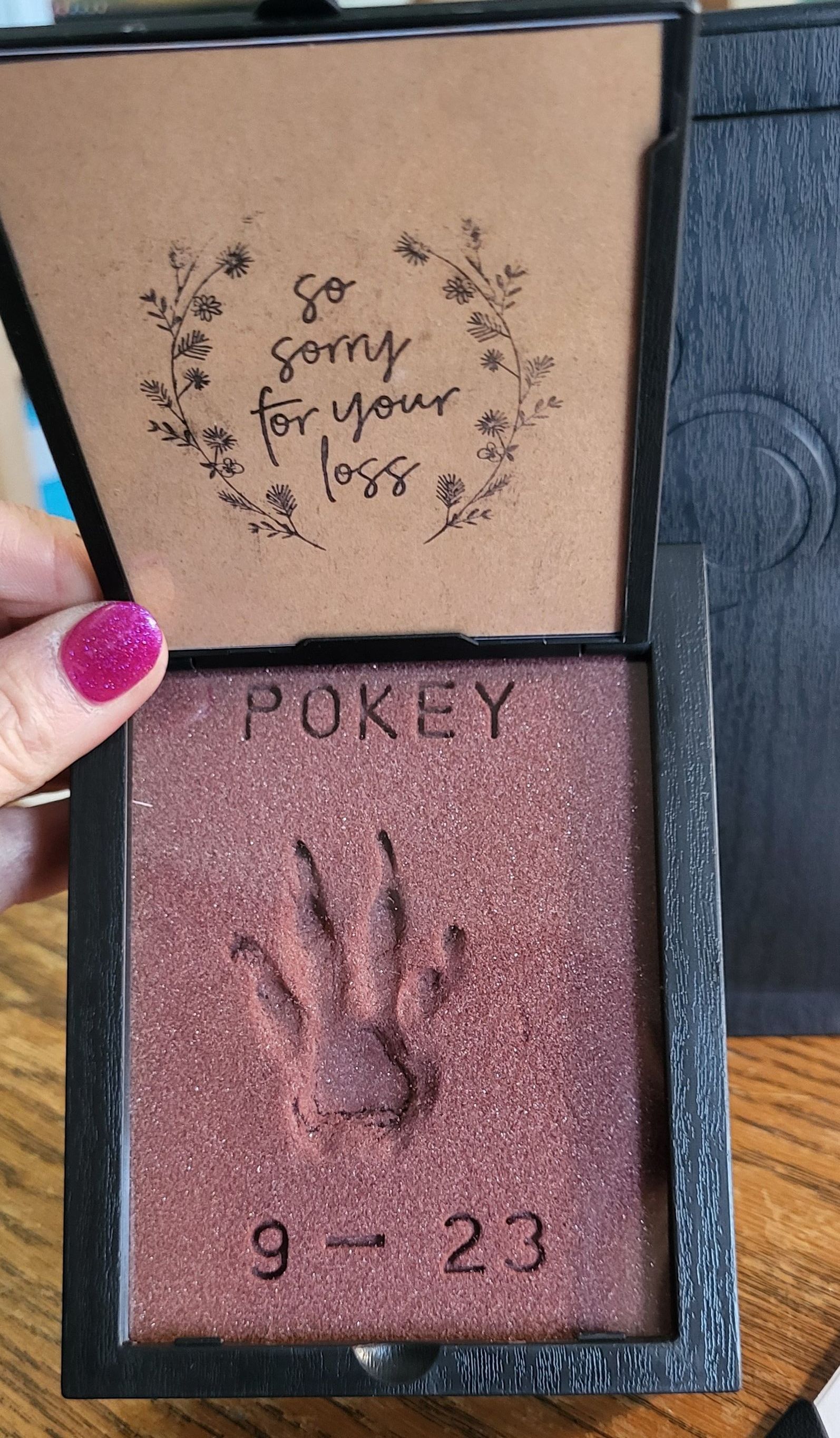 -With the cremated remains of your pet, you will also receive a card with their paw print, swatch of their fur and an online animal obituary (rainbow bridge) at no charge.